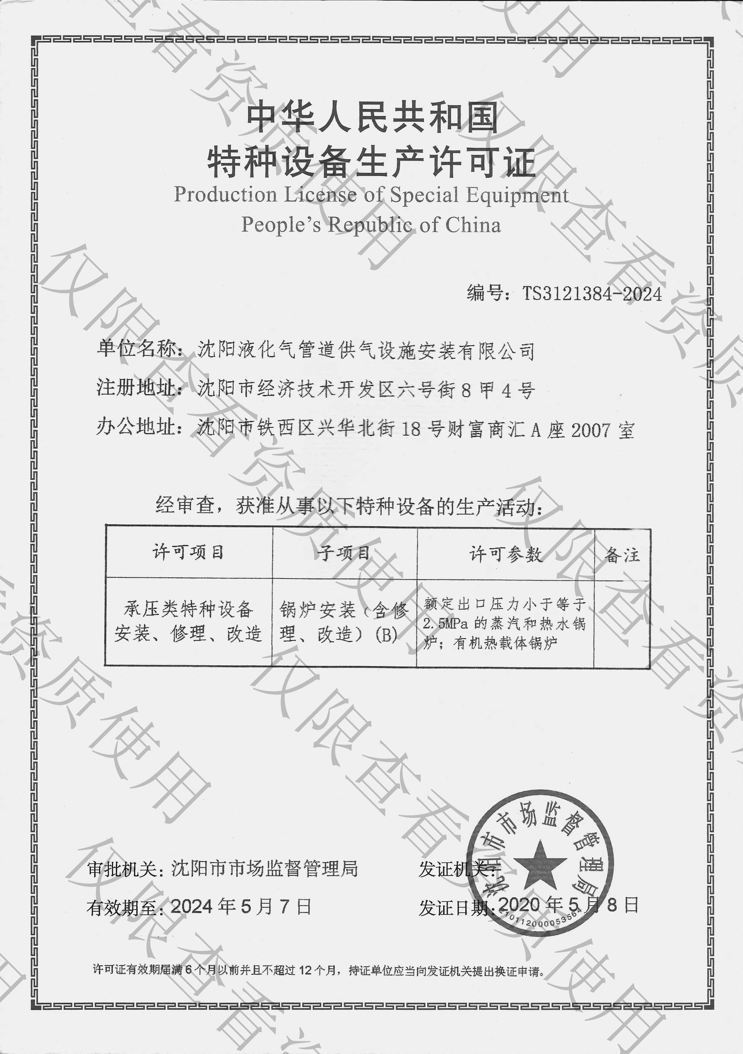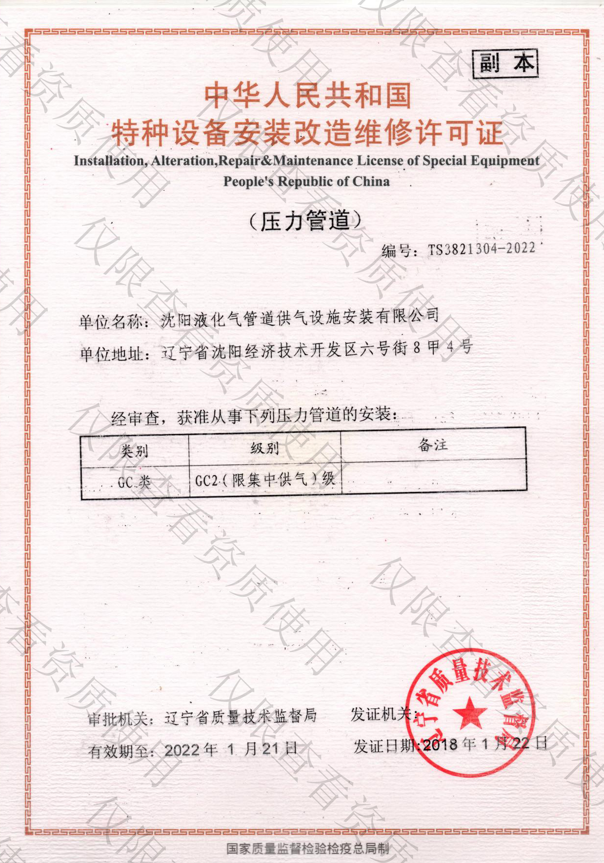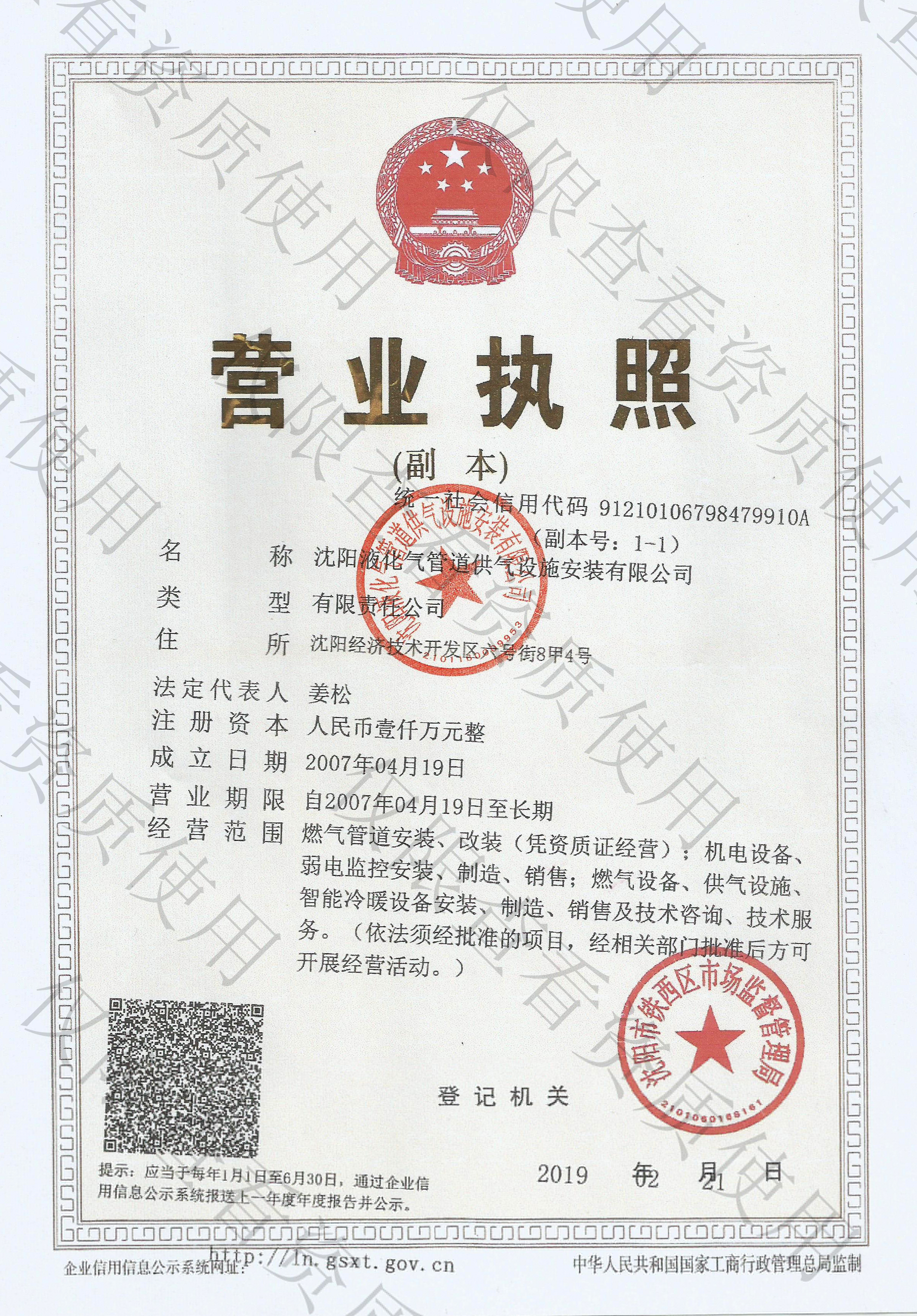 沈阳液化气管道供气设施安装有限公司成立于2007年04月19日,注册资金1000万元,公司总部位于沈阳市铁西区,办公面积1000多平方米,是东北地区最具专业性的机电设备安装公司之一。本公司持有建筑机电安装工程专业承包资质,特种设备生产许可证,GC2、GB1、GB2压力管道安装许可证,锅炉安装许可证,安全生产许可证,AAA级企业信用等级证书等一系列资质证书。公司于2021年顺利通过ISO9001:2015质量管理体系认证,ISO14001:2015环境管理体系认证,GB/T45001-2020职业健康安全管理体系认证,并持续运行保持。