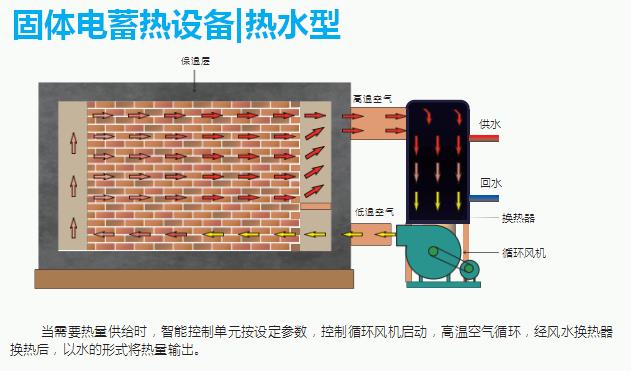 固体电蓄热设备在夜间将廉价的 低谷电能转化成热能进行储存,在白 天向用热单元供热,也可在夜间蓄热 的同时向用热单元供热。固体电蓄热 设备的储存效率可达到98%,储热介 质的工作温度范围可在80~850℃之 间。可根据用户实际供电情况选择 0.4kV、10kV、35kV、66kV设备电压 等级,按用户的实际供暖需求进行设 备定制。